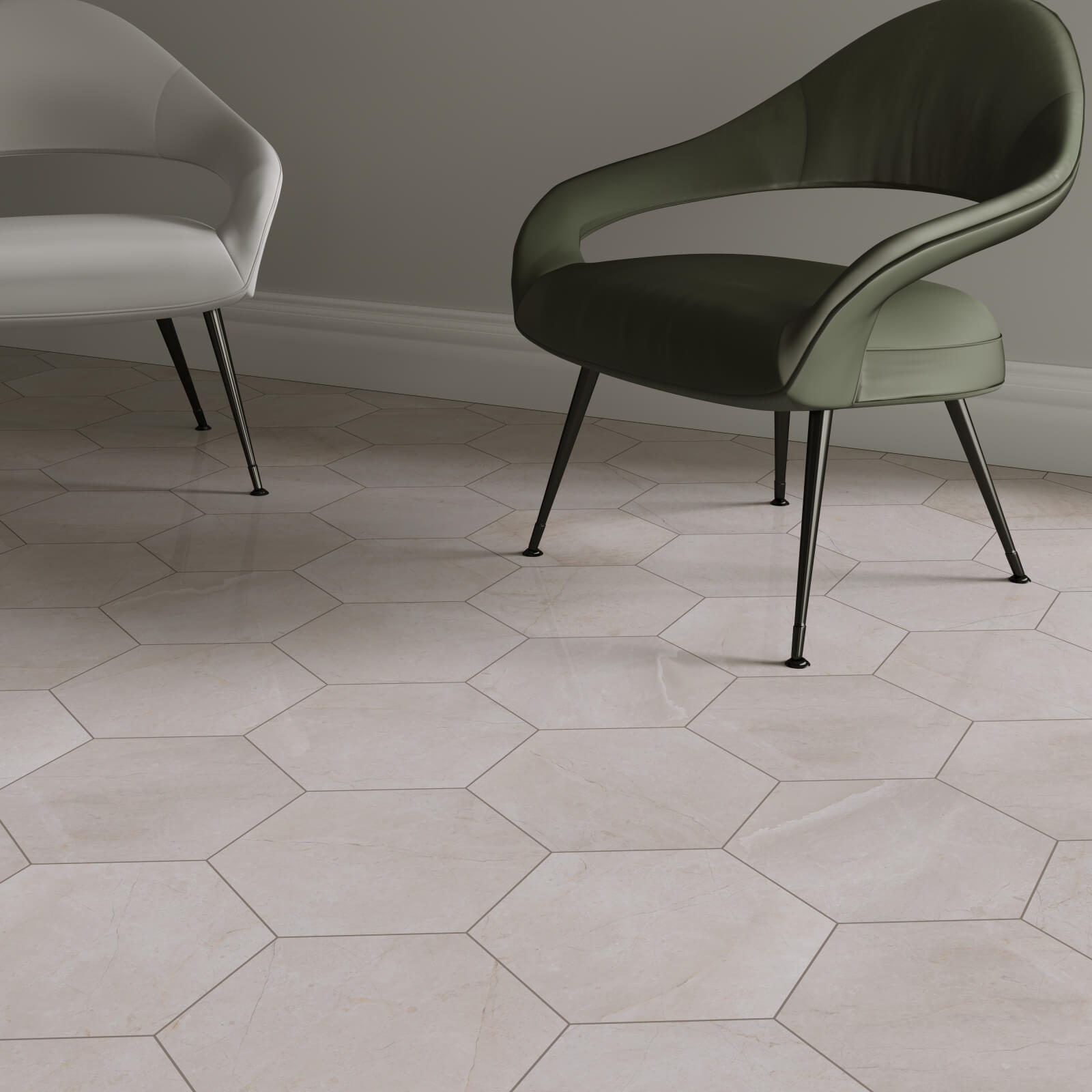 The Crema Marfil marble is simply one of the most popular marble stones in our range of marble tiles. This particular hexagon shape has a 15 cm side lengths, so slightly larger than some of our other hexagon lines. This means fewer grouting lines and more surface area covered with each tile, which makes installation easier than smaller hexagons.
