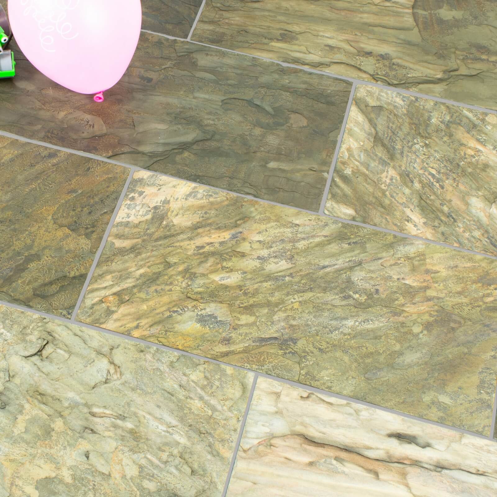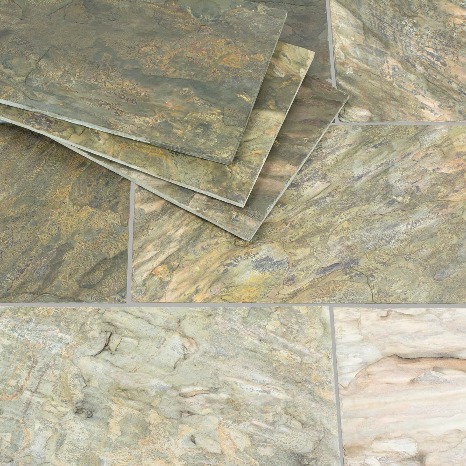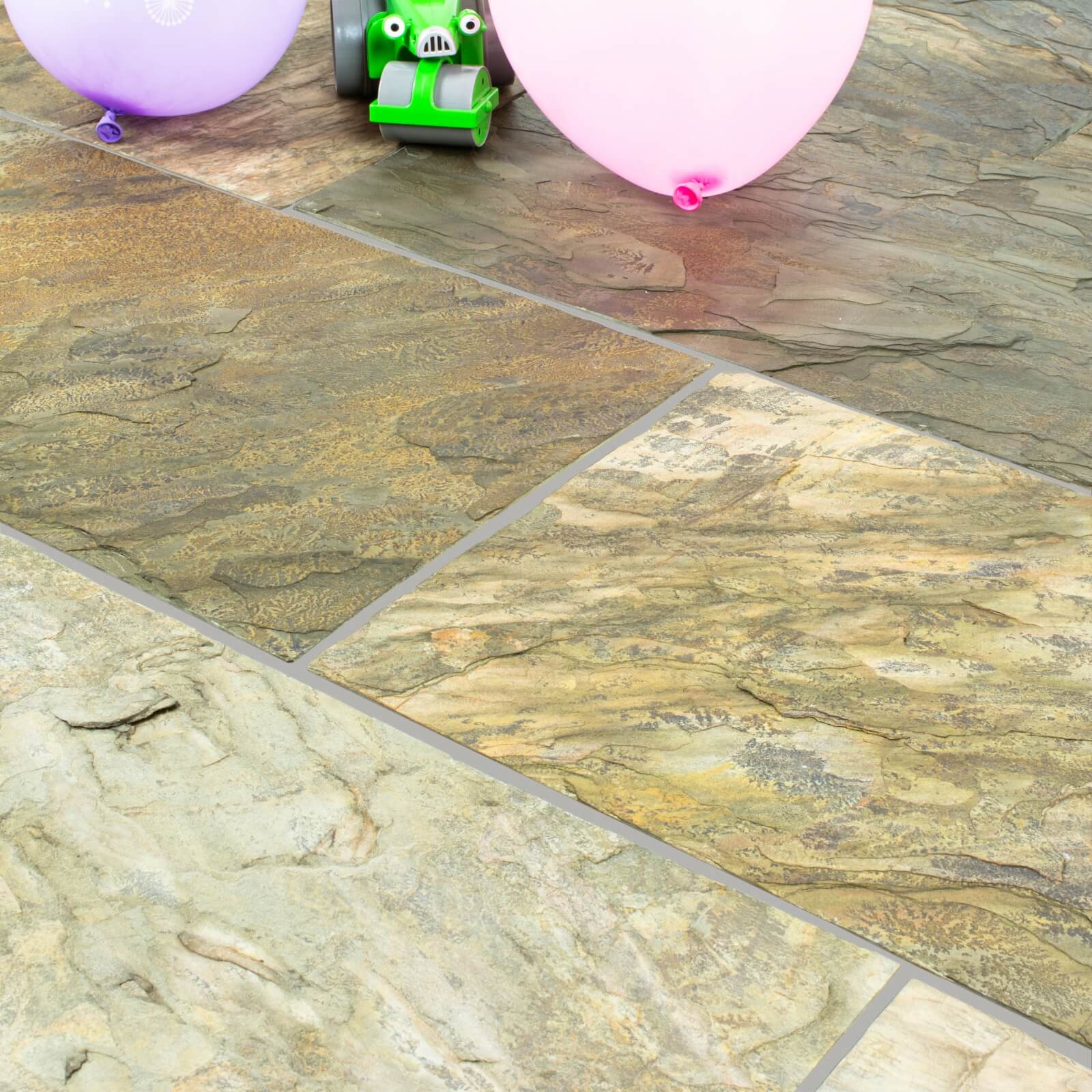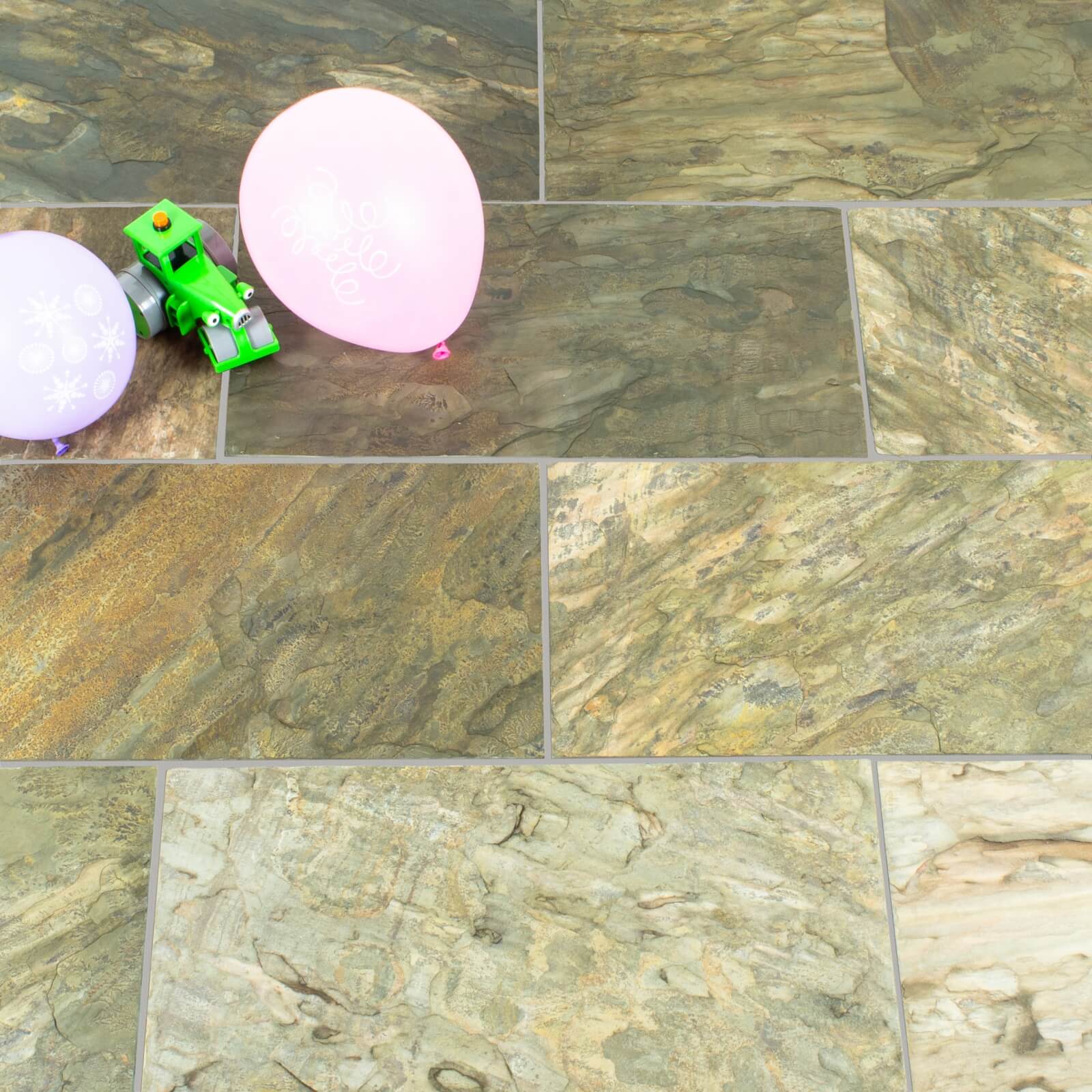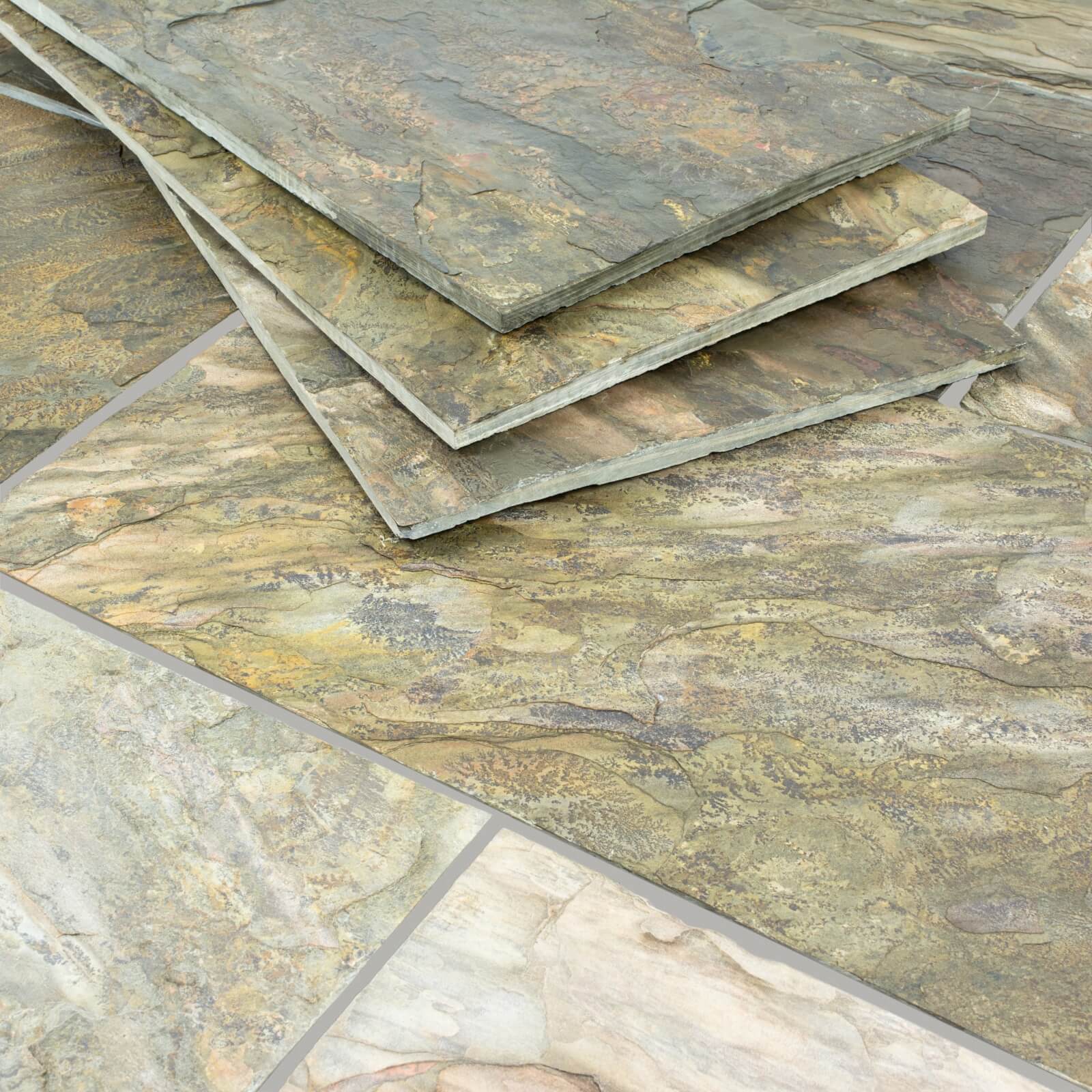 These slate tiles boast a rich mix of colours, orange, gold, blues entwined to make an eccentric mix of flooring. The riven edge finish gives the tiles a unique look, adding depth and character to any room. You'll be pleasantly surprised.